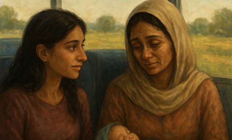 the vibrant scenery outside. She settled beside me, her eyes fixed on a tiny bundle in her arms.