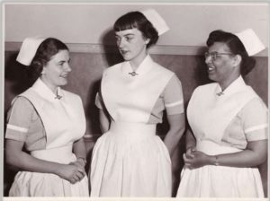 As ladies hair grew shorter in length, the cap became smaller with each hospital having a unique style of cap. The addition of a coloured belt and stripes to indicate seniority was introduced by some.