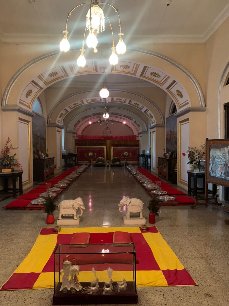 The Museum also houses the Banquet Hall that features a huge dining table with the famous Silver Train that was used for serving wine, snacks, cigars to guests during grand dining events. Across, the Banquet Hall is the Taat-Paat room which is used as another dining room by the Scindia royal family with a traditional floor arrangement with silver taats (thalis).