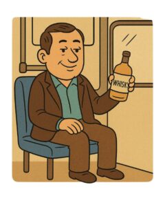 With a bottle of whisky