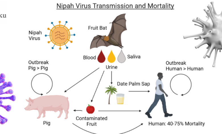 The Nipah virus is a zoonotic virus, meaning that it can be transmitted from animals to humans. The virus is spread through the saliva or urine of infected fruit bats. Humans can become infected by eating fruit that has been contaminated with bat saliva or urine, or by coming into direct contact with infected bats or their bodily fluids.