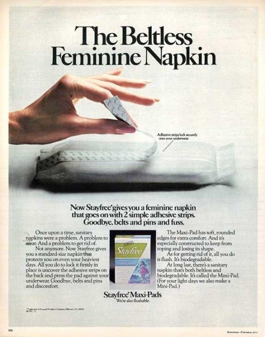 1980 was the time of advent of the adhesive sanitary napkin we use today. Pads like Kotex used wood pulp which was highly absorbent and as time has gone by we have come up with variations of this pad with increased absorbent capacity and thinner dimensions and the concept of wings to help it stay in place.