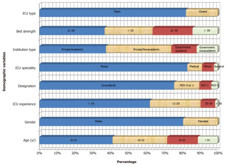 It was found that there was a need for improved manpower including in-house intensivists and decreasing patient-to-nurse- ratio. As sepsis was the most commonly encountered diagnosis the survey findings suggested a need for prioritizing quality and research initiatives to decrease sepsis mortality and efforts to limit ICU stay.