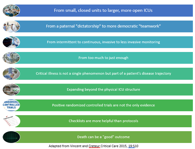 Vincent et al in the 2014 supplement of Critical Care discussing Future of Critical Care Medicine (FCCM) listed certain paradigm shifts that are helping modern ICUs usher into the new era.